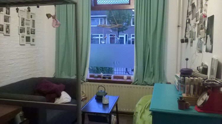 De kamer heeft een groot raam en een eigen wastafel, en er staat een tweepersoons hoogslaper in die je over mag nemen. De kamer is wit geschilderd en heeft laminaatvloer. De kamer bevindt zich op de begane grond. Naast de kamer heb je een gezellige gemeenschappelijke woonkamer (incl. TV) met keuken en eethoek. Verder deel je de WC en de badkamer met douche en wasmachine met jouw huisgenoten. Het huis heeft een voortuin waar we vooral in de zomer vaak zitten, en een achtertuin met een fietsenstalling.